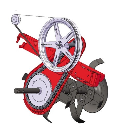 Der Antrieb der Hackwerkzeuge erfolgt über eine Kette im Ölbad laufend, während der primäre Antrieb über Keilriemen zwischen Motor und Getriebe erfolgt. Die Keilriemen werden durch eine Schutz-Abdeckung geschützt und sind so für die Wartung leicht zugänglich.