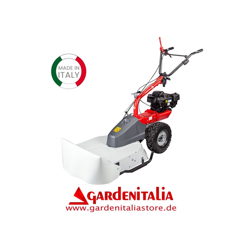 Selbstfahrender Hochgrasmäher mit 4-Takt-Benzinmotor, großen Lufträdern (Laufflächenprofil) verbunden mit einem Schneckengewinde im Ölbad und Riemen und 5-gängiges Getriebe (3 Vorwärtsgänge + 2 Rückwärtsgtänge).